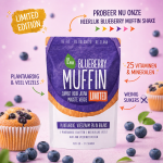 plantaardige eiwit mix (gele erwt, bruine rijst, linzen, tuinboon, pompoen), vezelmix (acai bes, maqui bes, appel, camu camu bes, acerola, bosbes, rode bosbes, ginseng wortel, wortelsap, bietensap, tomatensap, spinazie, boerenkool, collard, peterselie, broccoli, spruiten, bloemkool), vitamines & mineralen mix, natuurlijk blueberry muffin aroma, omega 3 (algen), verdikkingsmiddel (xanthaangom), konjac gom, zoetstof (stevioglycosiden), conserveermiddel (sorbinezuur), antioxidant (ascorbinezuur), emulgator (zonnebloemlecithine)